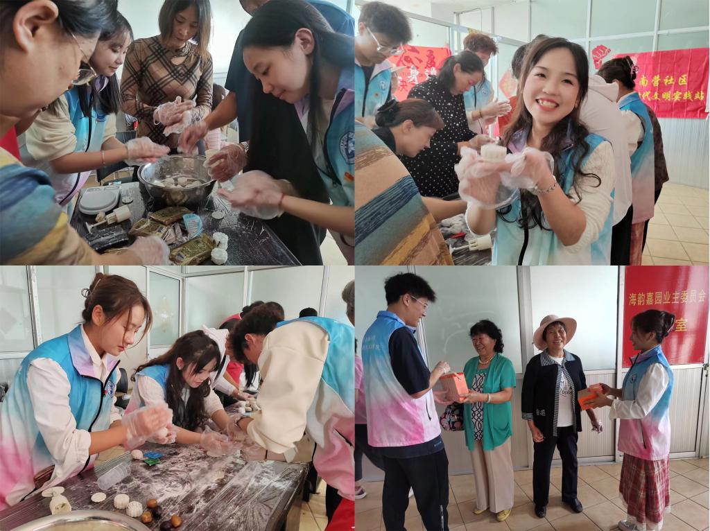 迎中秋话幸福,体验传统文化。南营社区志愿者刘阿姨向员工们介绍了中秋节的由来、当地习俗,并围绕“祭月”“拜月”“赏月”“追月”以及“吃月饼”等传统习俗进行分享,同学们为社区居民们解析古诗《十五夜望月》和《望月怀远》等。在月饼制作环节,在社区阿姨的悉心指导下,员工们纷纷化身成月饼制作师傅,戴起手套,按部就班制作起来,揉搓糯米团、包馅料、撒糯米粉、按压成型……一气呵成,一块寓意着团圆的冰皮月饼就出炉了。每个人从开始的小心翼翼互相观望,到后来的驾轻就熟、得心应手,在一片欢声笑语中,一枚枚精美可爱的冰皮月饼逐渐成型,浓郁的香味弥漫在整个活动室,大家将做好的月饼放进精美的包装盒中,送到居民手中。居民们开心地和员工拉起了家常,“中秋佳节,吃到年轻人亲手做的月饼,心里也是暖暖的,欢迎你们常来社区,常回家看看。”