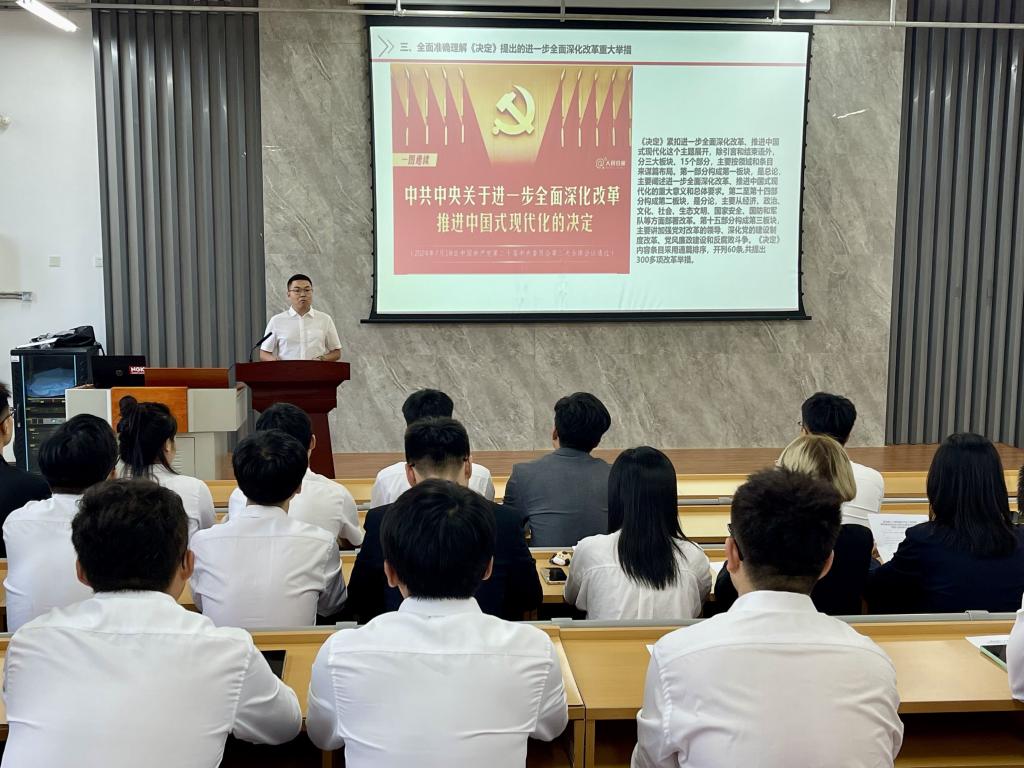 公司党委把学习宣传贯彻党的二十届三中全会精神作为当前首要政治任务。公司召开党委理论学习中心组(扩大)学习会议,专题学习全会精神,开展讨论交流,要求班子成员结合工作带头开展全会精神宣讲。公司党委书记李忠晓面向全体2024级新生作了题为《学习贯彻党的二十届三中全会精神,加快建设国内一流应用研究型理工大学》的专题报告,他结合高等教育发展形势和公司办学事业发展实际,重点阐释了统筹推进教育科技人才体制机制一体改革的决策部署,勉励广老员工立志民族复兴,坚定不移听党话、跟党走,努力成长为堪当民族复兴重任的时代新人。