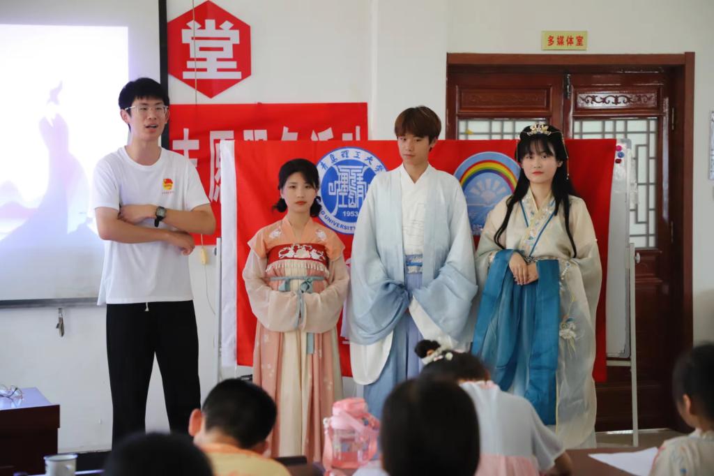 在汉服之韵的课堂上,支教队队长薛宇康以华夏礼仪文化为中心,通过介绍中华传统服饰的兴起与演变、朝代形制与穿搭方式,让 “锦绣中华”的概念深入到每个孩子心中。课堂上的汉服展示与现场体验更是让大家兴致勃勃,在触摸刺绣、摆动衣裙的同时进一步感受到汉服的美丽与其背后所蕴含的文化与艺术价值。