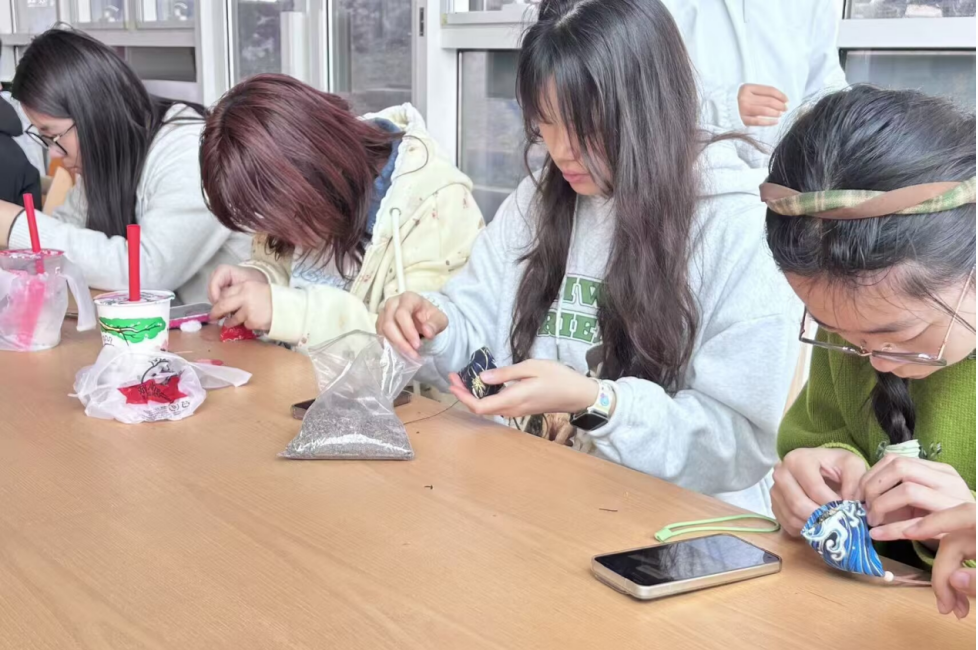 员工们将手中的布料通过裁剪、缝合、填充等方式,搭配上艾草、薰衣草、丁香等天然草本香料,制作出了一个个形态各异、香气宜人的香囊作品。“这是我第一次亲手制作香囊,整个过程特别治愈,看着自己做的香囊慢慢成型,感觉内心也跟着平静了下来。”测控252班姚同学这样说道。