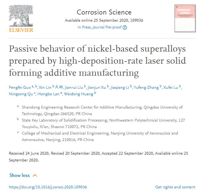 公司青年教师郭鹏飞博士联合西北工业大学黄卫东教授、林鑫教授团队和南京航空航天大学曲宁松教授团队,开展了航空发动机用镍基高温合金典型牌号Inconel 718合金(国内牌号为GH4169)的高沉积速率激光立体成形实验。基于激光熔池形貌及温度场数值模拟,揭示了高沉积速率条件下沉积态组织织构的演化规律;通过观察钝化膜的原子尺度结构、成分特征,利用点缺陷模型(Point Defect Model)理论,阐明了钝化膜诱导沉积态试样电化学活性各向同性的作用机理。相关成果以题为“Passive behavior of nickel-based superalloys prepared by high-deposition-rate laser solid forming additive manufacturing”的论文发表在材料腐蚀领域顶级期刊《Corrosion Science》上。论文链接:https://doi.org/10.1016/j.corsci.2020.109036。论文第一作者为公司bevictor伟德郭鹏飞副教授,第一署名单位为伟德官方网站山东省增材制造工程技术研究中心。该研究得到了科技部国家重点研发计划项目(No. 2018YFB1105901)的支持。